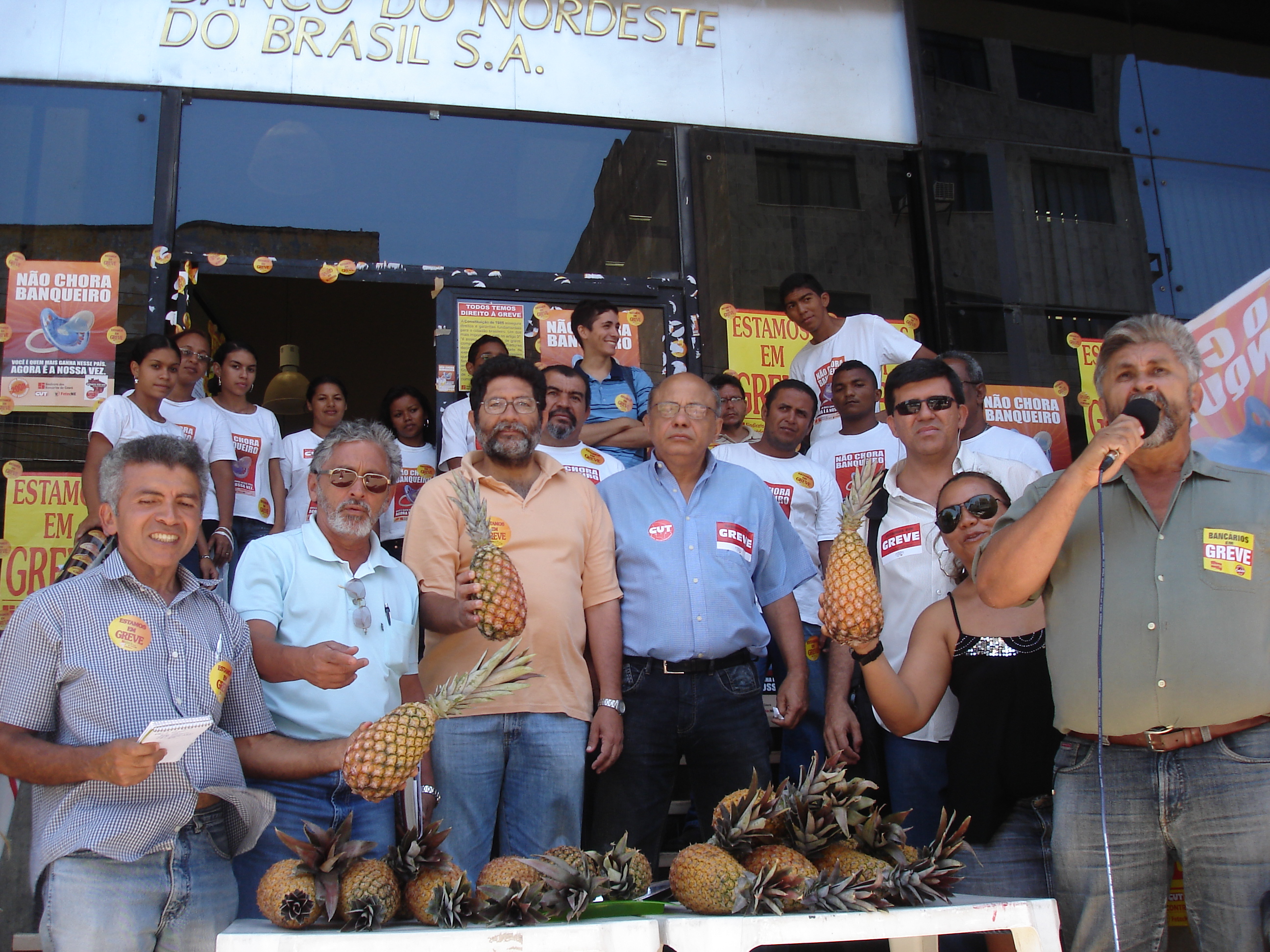 Munidos de abacaxis, funcionários do Banco, diretores da Associação e do Sindicato protestavam quanto à demora do Banco em apresentar propostas condizentes com as perdas da categoria nos últimos anos. Segundo o conselheiro da AFBNB, José Carleial, um dos idealizadores da manifestação de hoje, o protesto simboliza a leniência do Banco em negociar, deixando o “abacaxi” na mão dos bancários para estes o descascarem.