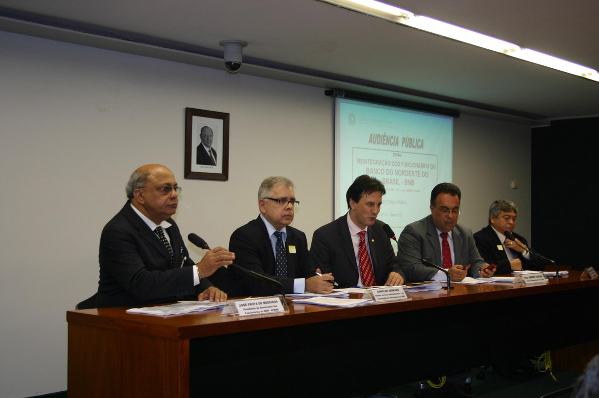 Hoje (24), a Comissão de Finanças e Tributação da Câmara Federal realizou audiência pública para debater o Projeto de Lei 343/2007, de autoria dos deputados federais Chico Lopes (PCdoB/CE) e Daniel Almeida (PCdoB/BA), que prevê a reintegração dos demitidos do Banco do Nordeste entre março de 1995 e fevereiro de 2003. Diretores da Associação dos Funcionários do BNB estiveram em Brasília para articulação com parlamentares no sentido de sensibilizá-los para que o PL seja votado e aprovado. Participaram da audiência pública, diretores da AFBNB, representantes da Comissão dos Demitidos, do Banco, do Sindicato dos Bancários do Ceará e parlamentares que apóiam o PL.